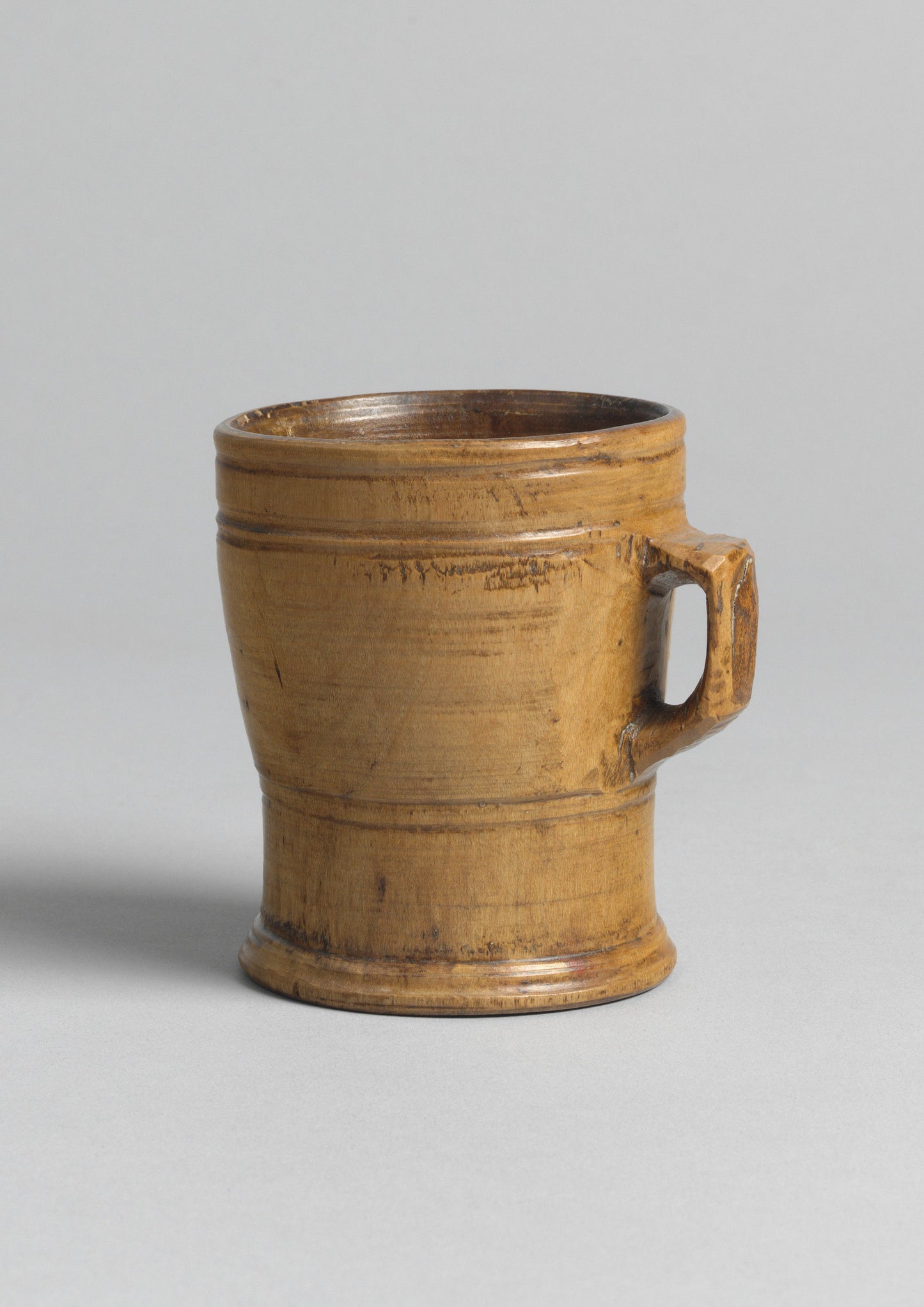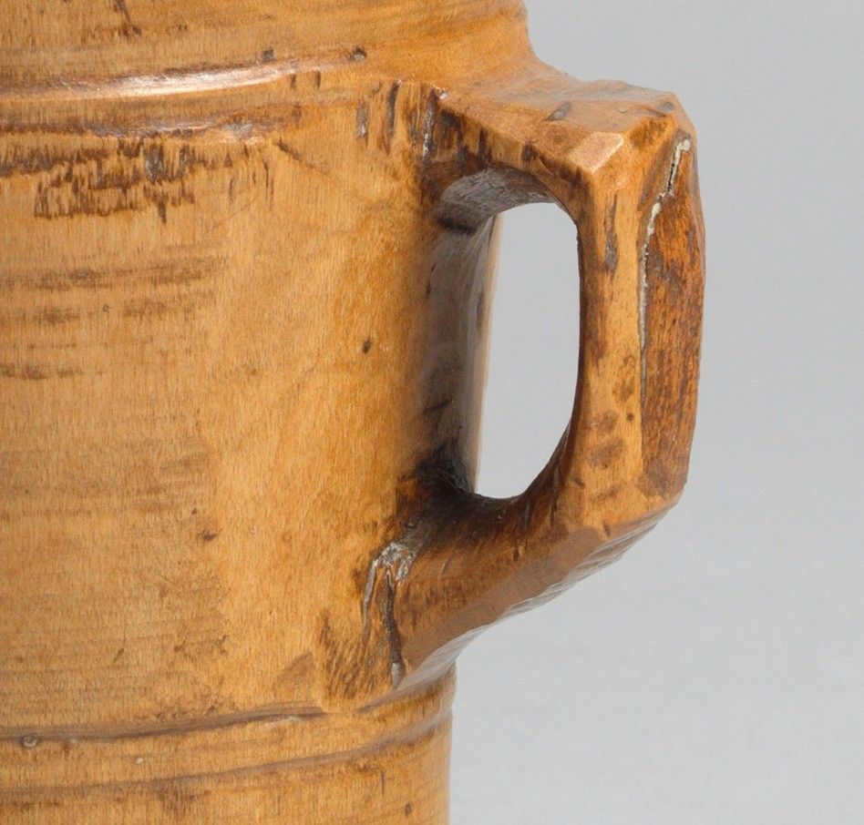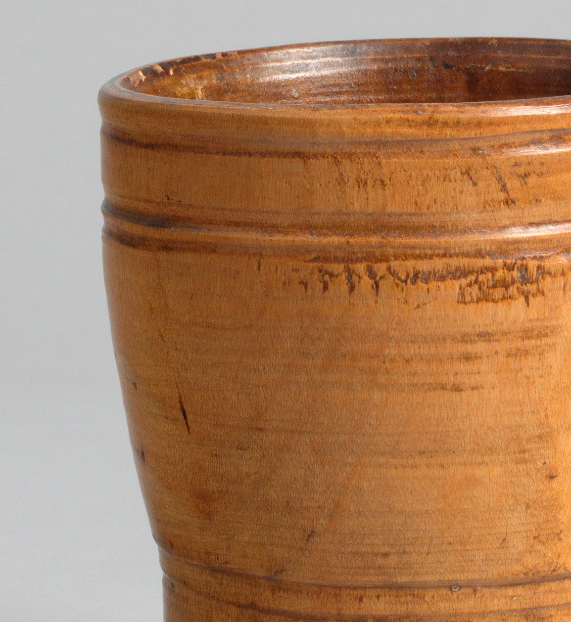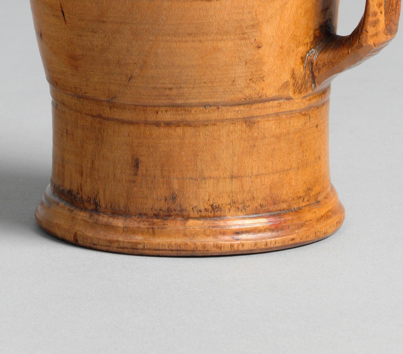 An unusually small and classically formed Lamhog, an Irish ceremonial drinking vessel. Now very rare, the delightfully shaped vessels are turned from solid willow and always have a single small lug handle. Close cousins to the noble Methers, (the larger rectangular formed four handled vessels of which virtually none survive outside institutional collections), both forms date back to the middle ages. Both Methers and Lamhogs are held in the national museum collections in Ireland, as well as being illustrated and discussed in Evan Thomas, Pinto and Levi. Folklore suggests that they were used as vessels of welcome and celebration. This example is in excellent original condition with a lovely faded colour and no structural issues, it is an unusually small size and has great traces of the original pole lathe turning. A rare and interesting survival and important piece from the Irish Folk Tradition.
