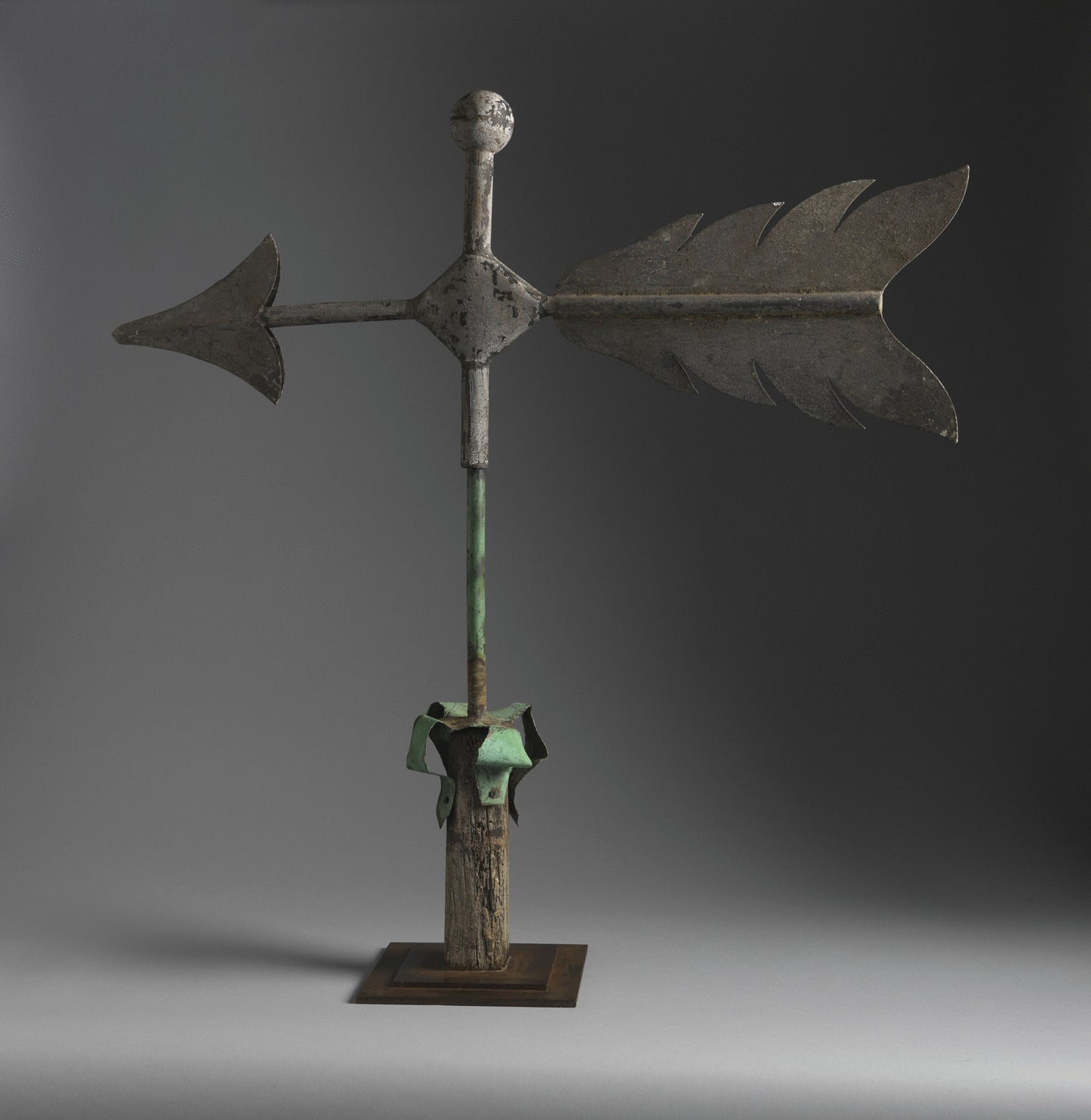 A simple well drawn traditional arrow form weather vane of restrained elegant design, with a ball finial above a generous point and well feathered arrow. Now bearing a pleasantly weathered and textured surface to the zinc and copper elements, it has a bold graphic appeal that would compliment an eclectic contemporary space. In good original condition and with delightful natural verdigris accent to the original stem.