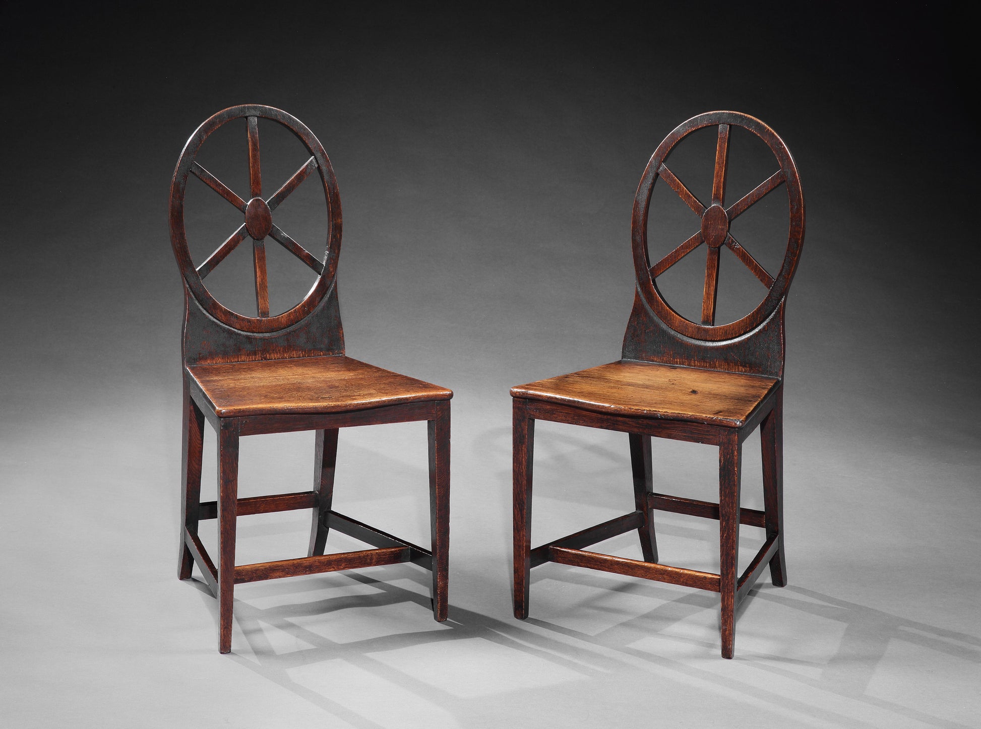 A Rare Pair of Graphic Vernacular "Wheelback" Side Chairs The Oval Backs above Shaped Boarded Seats and Tapered LegsSolid Well Patinated Oak English, c.183038" high x 18" wide x 20" deep