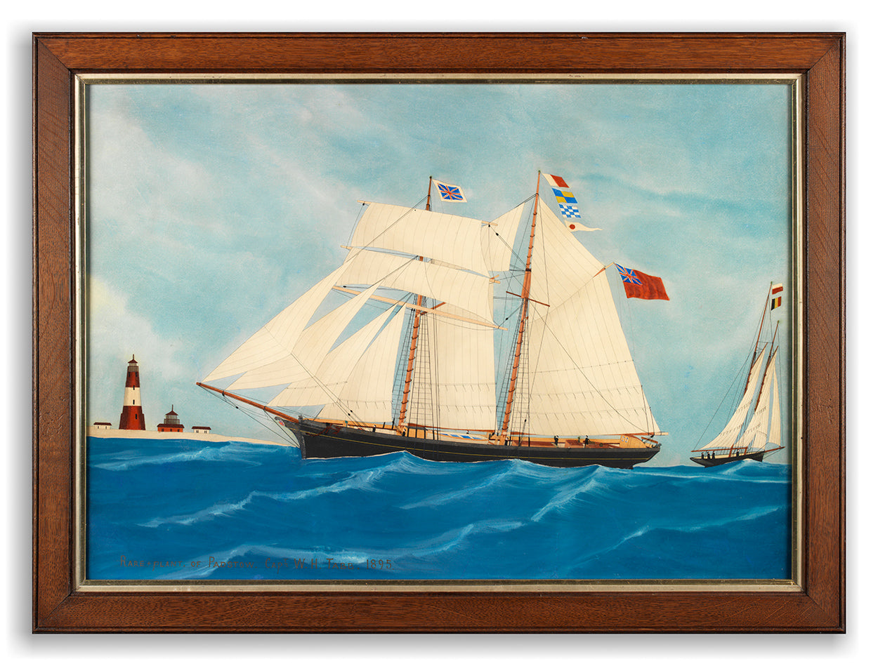 stylised, non- academic technique, sometimes enhanced by areas of gloss varnish. Several examples are also inscribed with the name of the vessel and details of the ship’s captain.