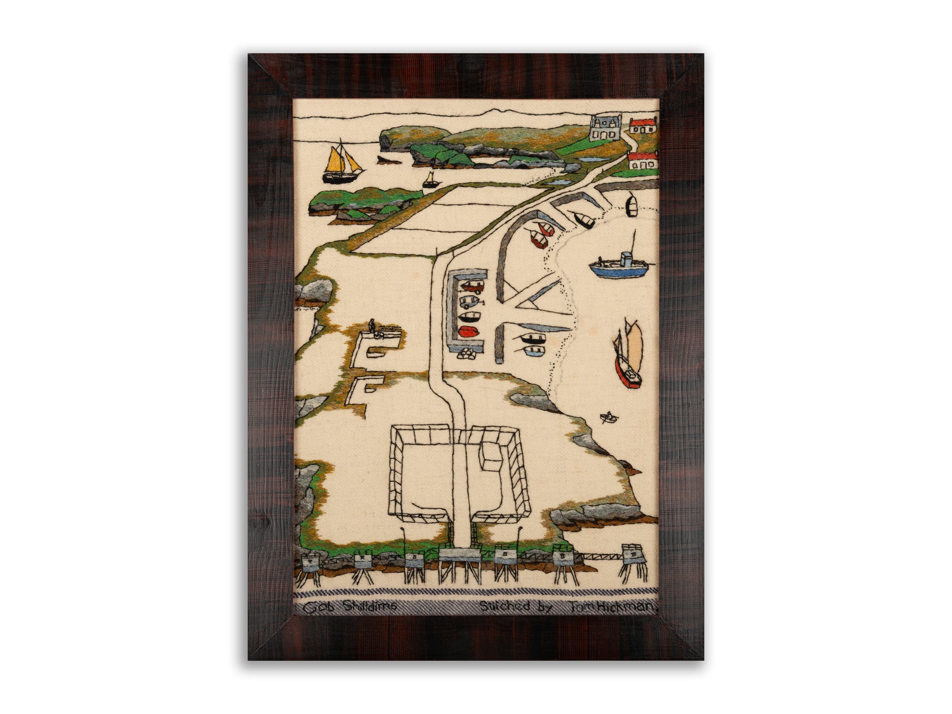 Gob Shilldims lies beyond the village of Holm on the way to Stornoway airport and is perhaps the largest pier construction on the island. It takes the large fuel tankers and, as such, is protected by a fenced off area. I have once again used the vertical format with a central road that takes you from the, (massively reduced in scale), pier past a, (very much enlarged), little boat ramp and the more realistic coastline leading back into town. I’ve included a small vignette of peat cutting, however, the works that remain are quite old and cutting has not taken place here for many years