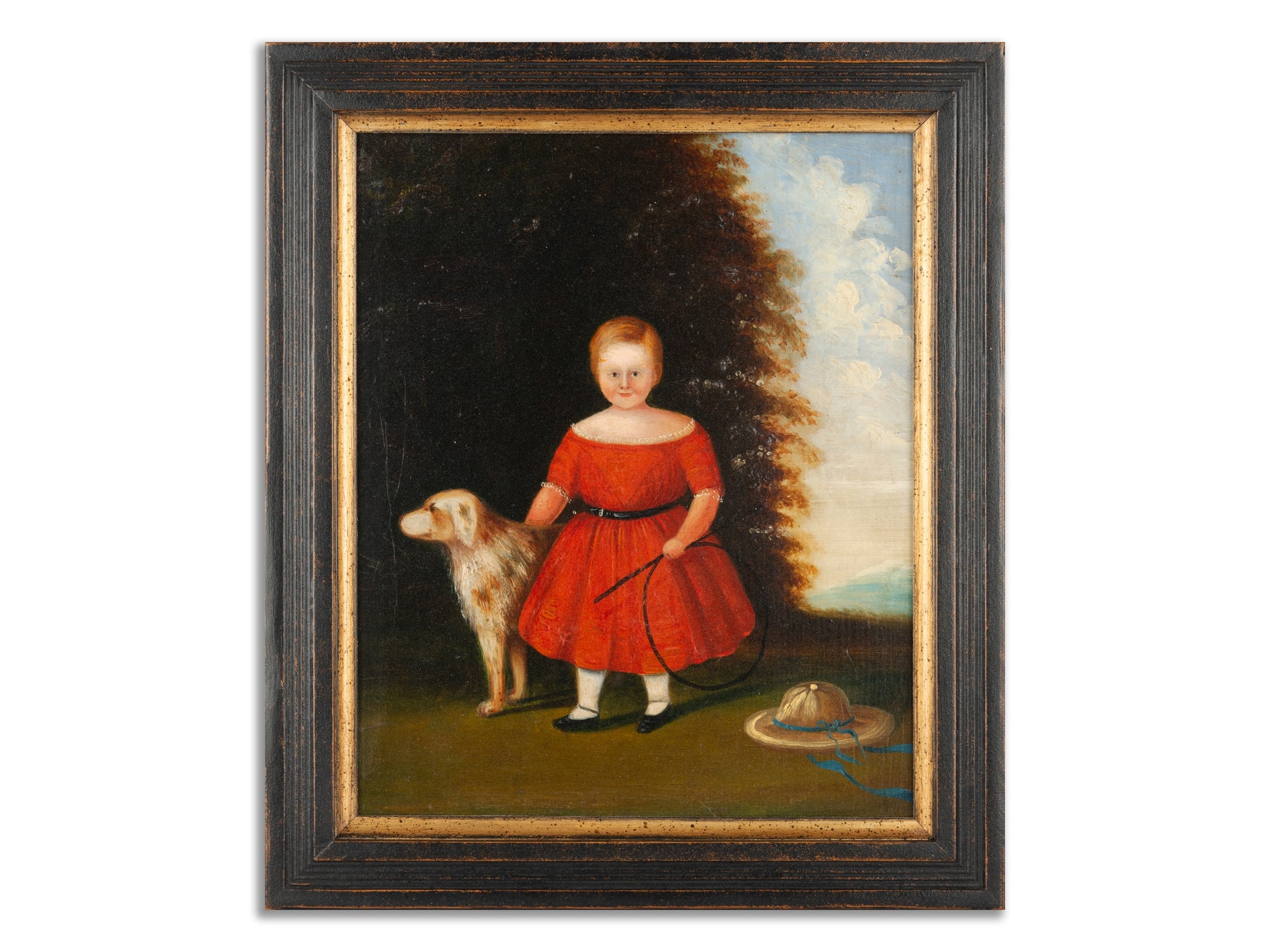 Depicting a Young Girl in a Red Dress and White SocksHolding a Whip, with Her Dog and Broad Rimmed HatOils on Wood Panel English, c.1850