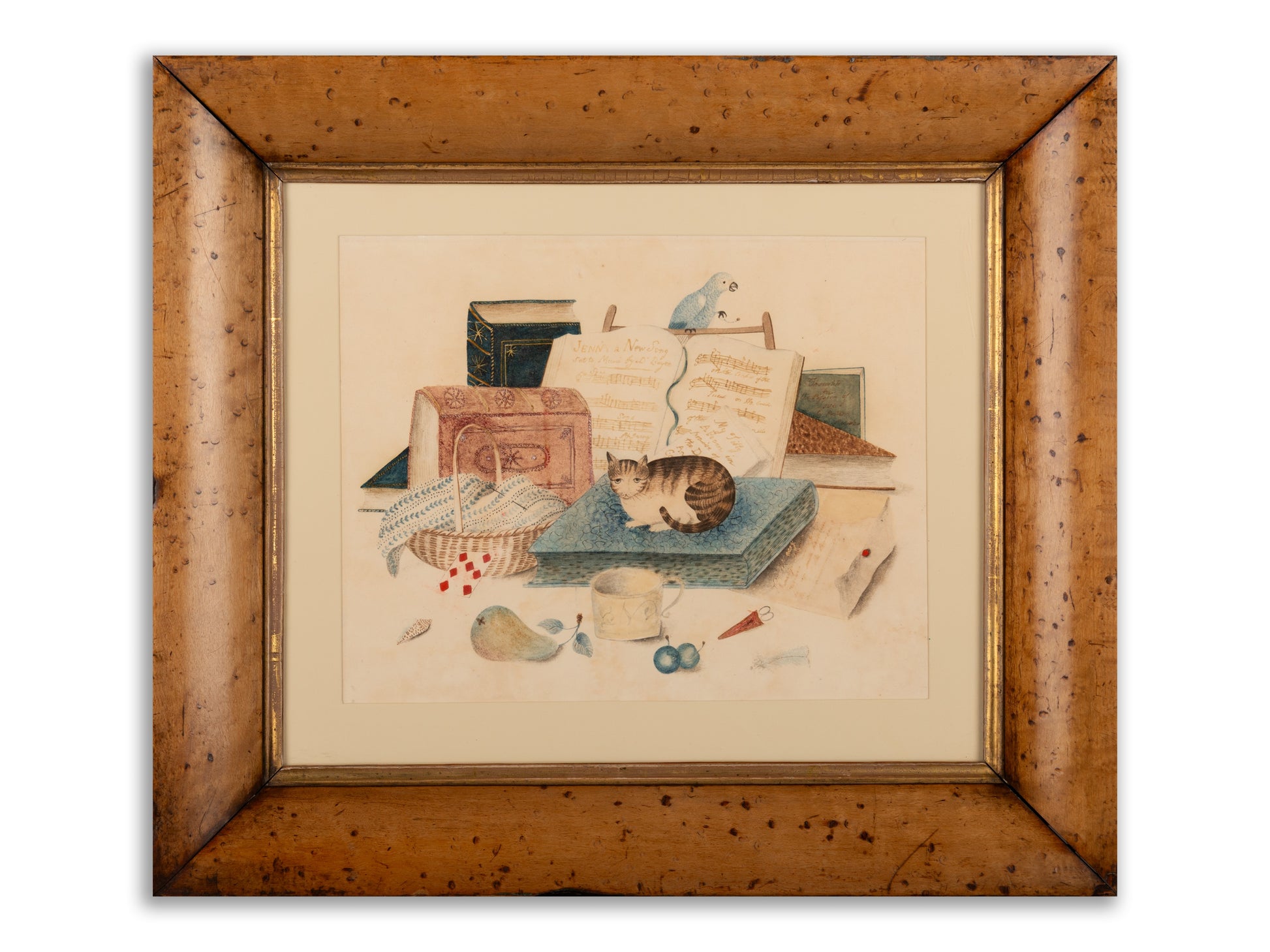 Delightful Naive Still Life Depicting A Parrot and Tabby Cat Surrounded by Books and Domestic Objects Pen, Ink and Watercolour on Paper in Original Maple FrameEnglish, c.1850