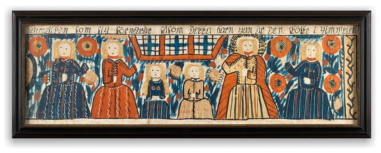 Water and Body Colour on Hand Made Card Traditional Kurbitz School Matthew Chapter 19, Verse 14 Sweden, c.1830 13.5'' high x 38'' wide (framed)