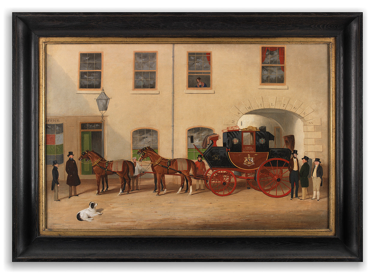 Depicting the Leeds-Carlisle Royal Mail Coach Outside The Bush Hotel Oils on Canvas English, Signed "R Harrington" and Dated "1848"