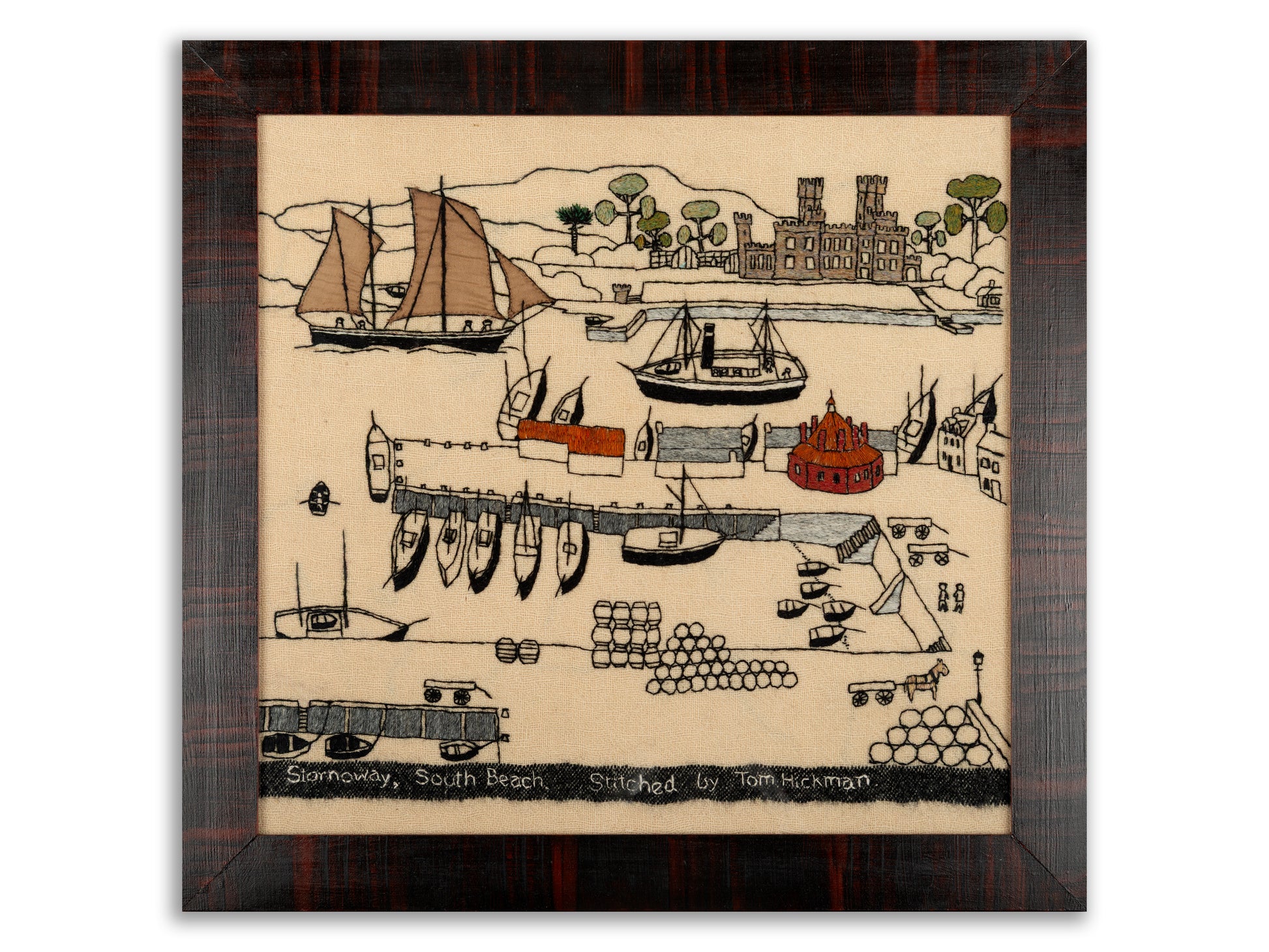 the view across the inlet to the castle grounds beyond. James Matherson commissioned Charles Wilson, a Glasgow architect, to build Lews Castle on the site of Seaforth Lodge. The foundation stone was laid in November 1847 and took six years to complete. The castle in reality is not visible from this angle, but through the naïve eye of an artist everything is possible. The castle actually overlooks north beach but that didn’t stop me shifting it a few hundred yards south.