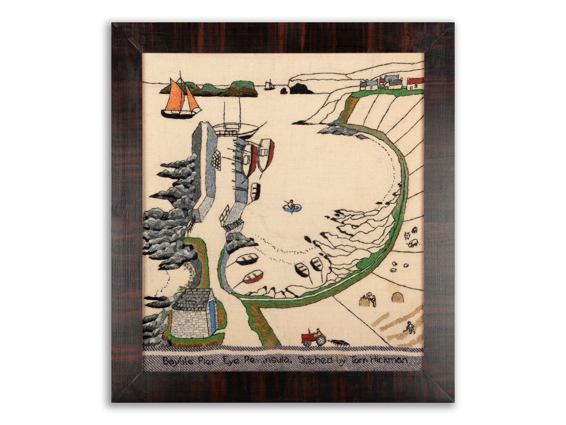 On that same Sunday I drove down to Bayble’s historic post office and a couple of hundred yards beyond lies the pier. Facing south west it is not the most sheltered of moorings, but the large curved bay with the steeply rising fan of crofts, along with the very distinctive islands offshore made it a perfect subject. Deciding what parts of the drawing require stitching in is often quite a random occurrence, and similarly knowing when to stop with detail and restriction of colour.