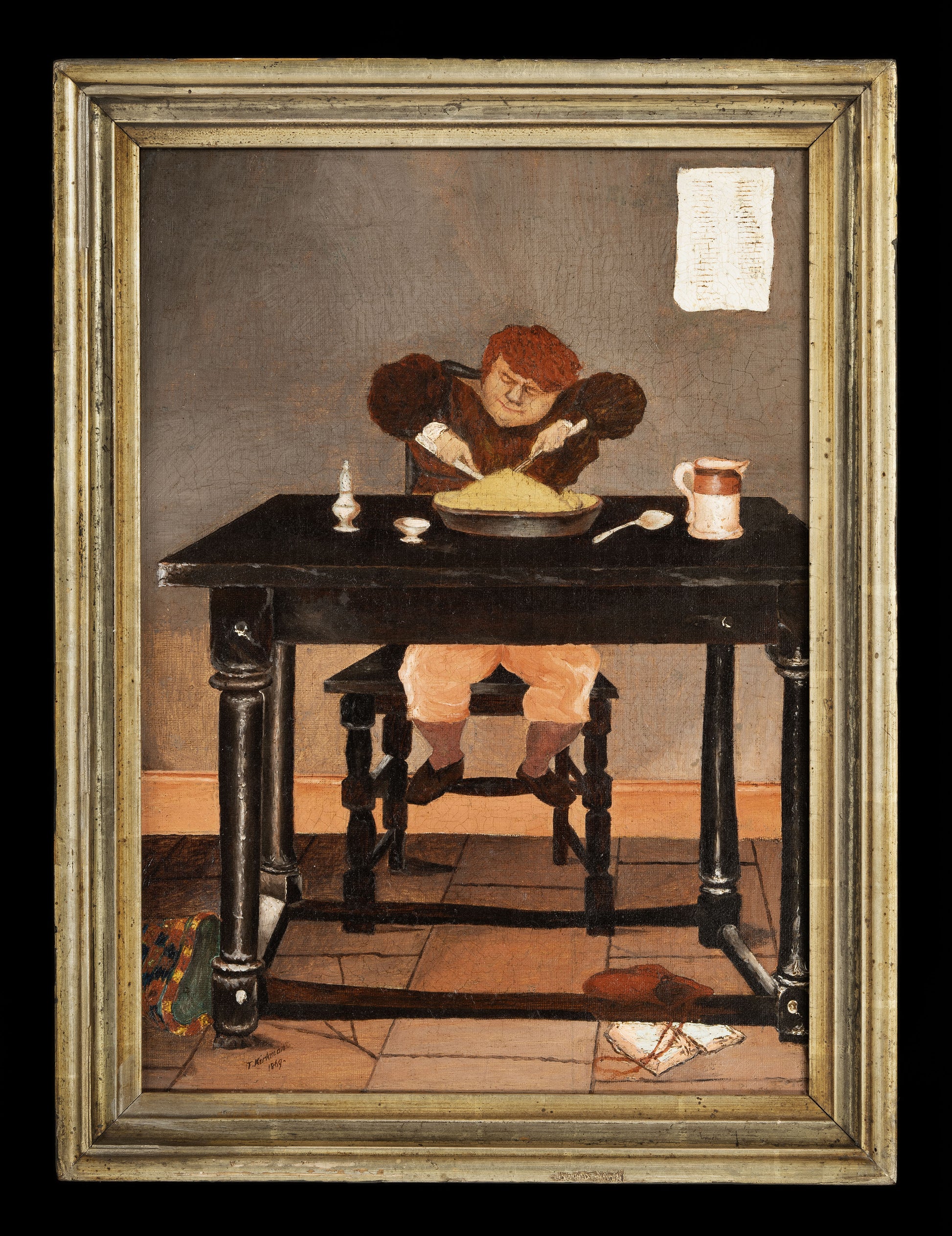 Unusual Naïve School Portrait of a Red Haired Boy Eating SupperSeated at a Well-Furnished Table with a Generous HelpingOils on Canvas in Original Giltwood FrameEnglish, Signed "T Kirkman" and Dated "1869"